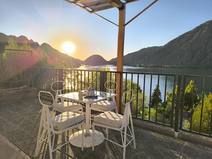 Teplá chata s výhľadom na jazero.