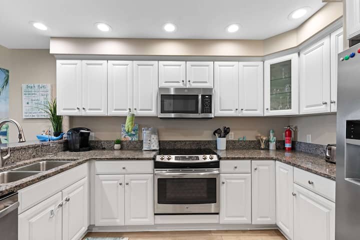 Vo vnútri prírodné svetlo zapĺňa otvorený obývací priestor, kde vás viacero pohoviek a ležadiel láká na oddych po dni strávenom na pláži. Posedzte si pri plynovom kozube alebo si pozrite svoje obľúbené programy na televízore s plochou obrazovkou a užite si útulnú noc. Plne vybavená kuchyňa má spotrebiče z leštenej nehrdzavejúcej ocele, žulové dosky, kávovar Keurig na kapsule a kávovar Mr. Coffee na zrnkovú kávu – ideálne na pokojné rána s rodinou.