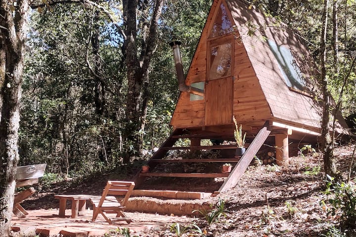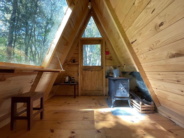 Chata sa nachádza pod spoločnými záhradami priamo v lese. Je to malá (približne 3 x 4 m) a jednoduchá drevená konštrukcia v tvare A s krbom (vrátane podpaľovača a palivového dreva), elektrinou (ohrievač vody a káva na 2 až 3 dni súčasťou každého pobytu), internetom Starlink, malým písacím stolom pri okne a kvalitným dvojitým matracom na podlahe (vrátane posteľnej bielizne, uteráky nie). Zrub má súkromnú terasu so stolom a dvoma stoličkami a jednoduchú umývaciu stanicu s lahodnou pitnou vodou zo zeme.