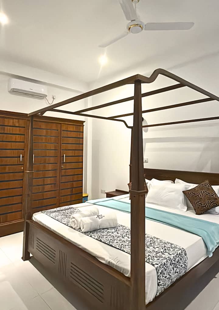 Vila je výlučne na vás, ponúka súkromie, bezpečnosť (s kamerovým systémom) a dokonalé útočisko len 80 metrov od pláže Weligama Bay. Uvoľnite sa, pracujte alebo objavujte – všetko je na vás!