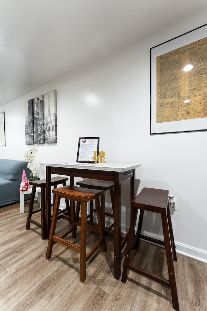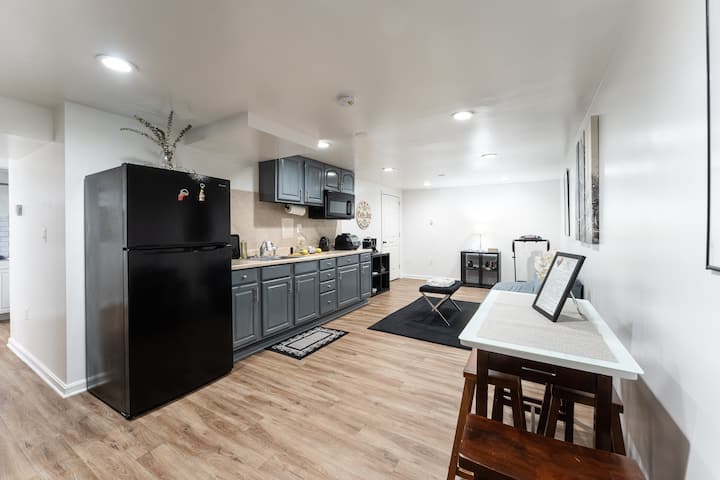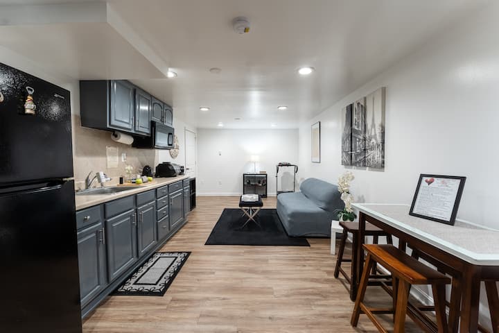 Oddýchnite si v tomto pokojnom, štýlovom suterénnom priestore v 3-podlažnom dome. Obe izby sú súkromné, každá pre maximálne dvoch hostí. Kúpeľňa, kuchyňa a obývacia izba sú spoločné. Každá izba má kútik na kávu, kávovar, bežnú chladničku a exkluzívne príbory. Sporák, rúra, hrnce, kuchynské náčinie a umývačka riadu sú spoločné. Klimatizačné jednotky môžu spôsobiť mierny hluk. Hostitelia vstupujú do suterénu len kvôli praniu alebo ak je iná izba prázdna. Dve malé hypoalergénne psy a tri tiché mačky bývajú na poschodí a nikdy nevstupujú do suterénu.
