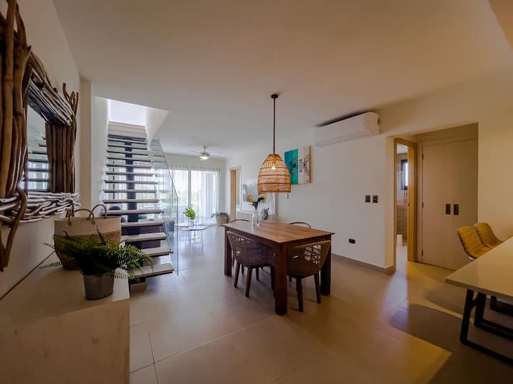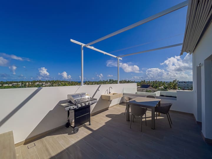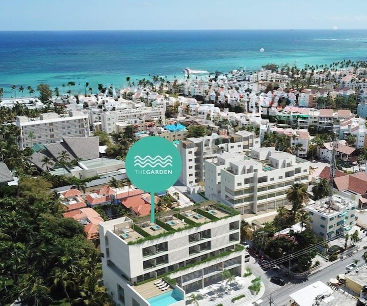 Nová ponuka december 2025! Záhrada A5 sa nachádza na jedinej ulici, ktorá ponúka priamy prístup na pláž. Zažite pôvab tohto elegantného dvojpodlažného strešného apartmánu, len kúsok od nádherného bieleho piesku a krištáľovo čistých vôd pláže Bavaro. Ponúka súkromnú strešnú oázu, osviežujúcu studenú vodu Picuzzi, úchvatný panoramatický výhľad a len krátku prechádzku na pláž. Predstavte si, že sa vraciate zo slnečného dňa, keď začne zapadať slnko, a ponorte sa do svojho osviežujúceho bazéna - naozaj neexistuje lepší spôsob, ako si oddýchnuť.