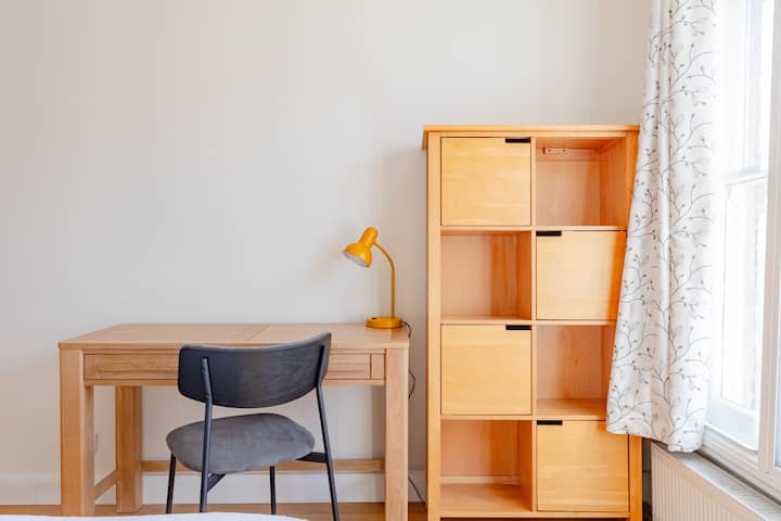Druhá spálňa ponúka manželskú posteľ s prémiovou posteľnou bielizňou a krásnym výhľadom na zeleň vonku. Úložného priestoru je dostatok, s kombináciou zásuviek a priestranným šatníkom od podlahy až po strop, vďaka ktorému sa ľahko zabývate a cítite sa ako doma, zatiaľ čo stôl a stolička poskytujú praktický pracovný priestor pre tých, ktorí potrebujú počas svojej návštevy zostať produktívni.