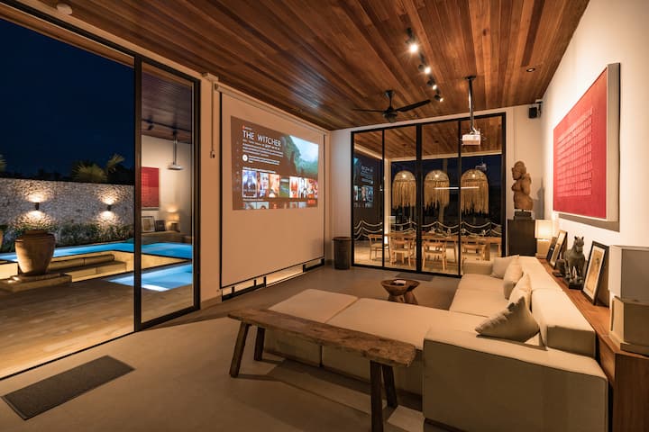 Priestranný obývací priestor vily slúži ako relaxačné centrum s pohodlnou pohovkou, stropným ventilátorom a projektorom na útulné filmové večery. Plne vybavená kuchyňa pridáva pohodlie pri príprave jedál, zatiaľ čo obývacia izba poskytuje dokonalý priestor na oddych a užívanie si času s blízkymi. Vila má aj druhú menšiu obývaciu izbu s balijskou posteľou a môže slúžiť ako televízna miestnosť alebo detská herňa.