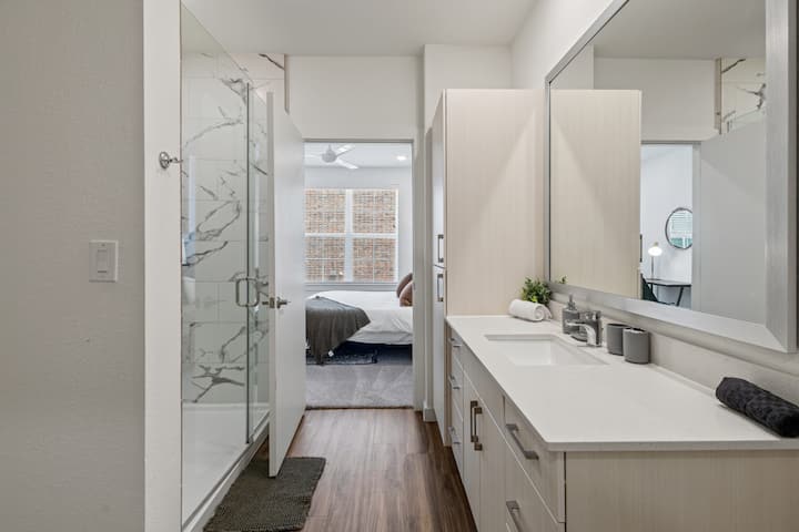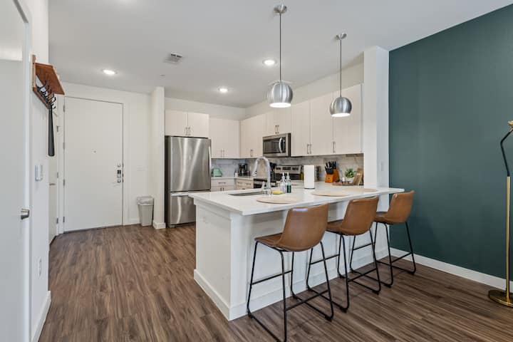 Zažite luxus a pohodlie v našom štýlovom apartmáne 1Br/1BA, len pár minút od centra mesta a najlepších atrakcií. Zobuďte sa v luxusnej manželskej posteli, vychutnajte si kávu v elegantnej kuchyni a oddýchnite si v kúpeľnej kúpeľni. Živé mesto je na dosah ruky s jedlom, nákupmi a zábavou v okolí. Oddýchnite si v elegantnom obytnom priestore alebo si vychutnajte výhľad na strechu. Perfektné útočisko na služobné cesty alebo voľný čas určené pre tých, ktorí oceňujú jemnejšie veci v živote.