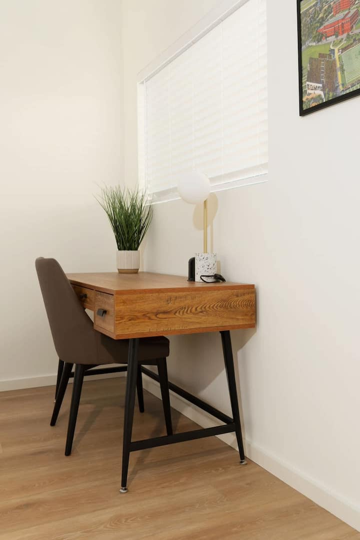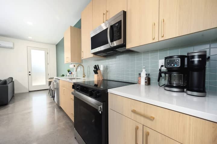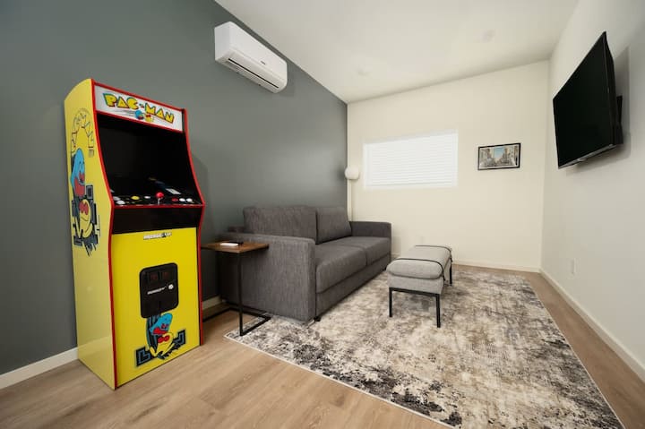 Úplne nový moderný apartmán v blízkosti historickej štvrte 4th & Gill v Knoxville. Užite si súkromný podkrovný byt na poschodí s arkádovou hrou, pracovným priestorom a pohovkou s manželskou posteľou a relaxačnou terasou so strunovými svetlami. Hlavná spálňa je vybavená manželskou posteľou King, inteligentnou televíziou a práčovňou v jednotke. Varte s ľahkosťou v plne zásobenej kuchyni a oddýchnite si v útulnom obývacom priestore s miestnym umením. Ideálne na služobné cesty alebo voľný čas, len pár minút od atrakcií v centre mesta.