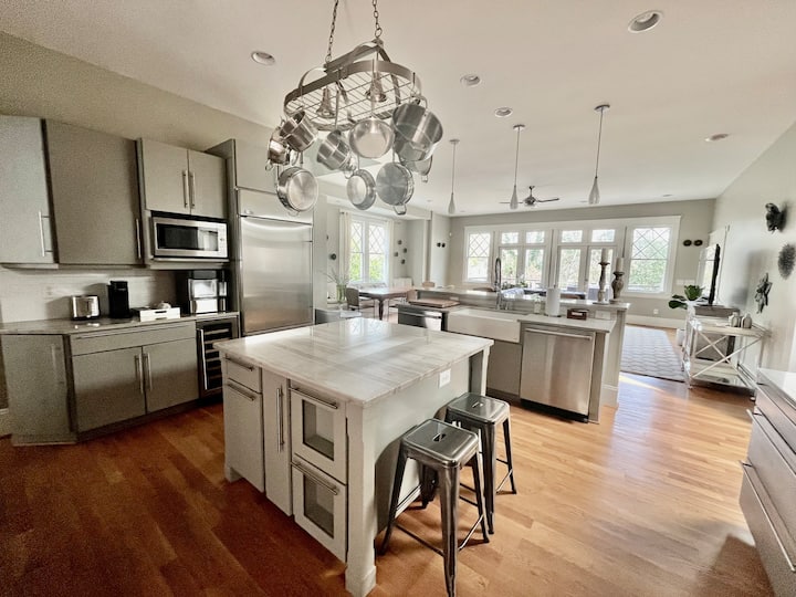 Na hlavnej úrovni je množstvo prirodzeného svetla s dvoma obytnými priestormi, kanceláriou/pracovňou, jedálňou a nádhernou a plne zásobenou gurmánskou kuchyňou. Kuchyňa je kulinársky sen s plynovým sporákom Viking so 4 horákmi a profesionálnou rúrou a je dobre vybavená súpravami, príborom a skleneným riadom až pre 10 hostí, všetkými potrebnými hrncami, panvicami a kuchynským riadom, ako aj „základnými“, ako sú papierové utierky, vrecia na odpadky, olivový olej, balzamový ocot, morská soľ, korenie, základné bylinky a koreniny, káva, smotana atď. Otvorený koncept kuchyne a obývacieho priestoru vytvára úžasný zábavný priestor. Vzdušný obývací priestor poskytuje dostatok pohodlného posedenia a okolo vnútorných aj vonkajších stolov je posedenie až pre 10 osôb, vďaka čomu je priestor ideálnym miestom na zhromaždenie pred svadbou alebo po nej, načerpanie nových síl po dni objavovania všetkého, čo táto oblasť ponúka, na oslavu významných príležitostí a sviatkov alebo len tak na oddych a oddych. Vychutnajte si rannú kávu a lahodné pochúťky od Boulted Bread buď na prednej verande, zadnej terase alebo na terase, prečítajte si knihu z knižnice v teple popoludňajšieho slnka, pomiešajte si kokteily happy hour a oddýchnite si na zadnej terase alebo terase počas západu slnka, aby ste sledovali, ako budovy v centre mesta Raleigh menia farby, uvarili lahodnú večeru z čerstvých surovín z Rebus Works Cafe + Grocery a Weaver Street Market a po zotmení zamierte na zadnú terasu osvetlenú strunnými svetlami. Gril (Big Green Egg) na terase je k dispozícii na požiadanie a ohnisko ponúka zábavné a útulné miesto na stretnutie za chladnej noci.