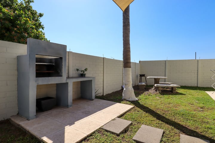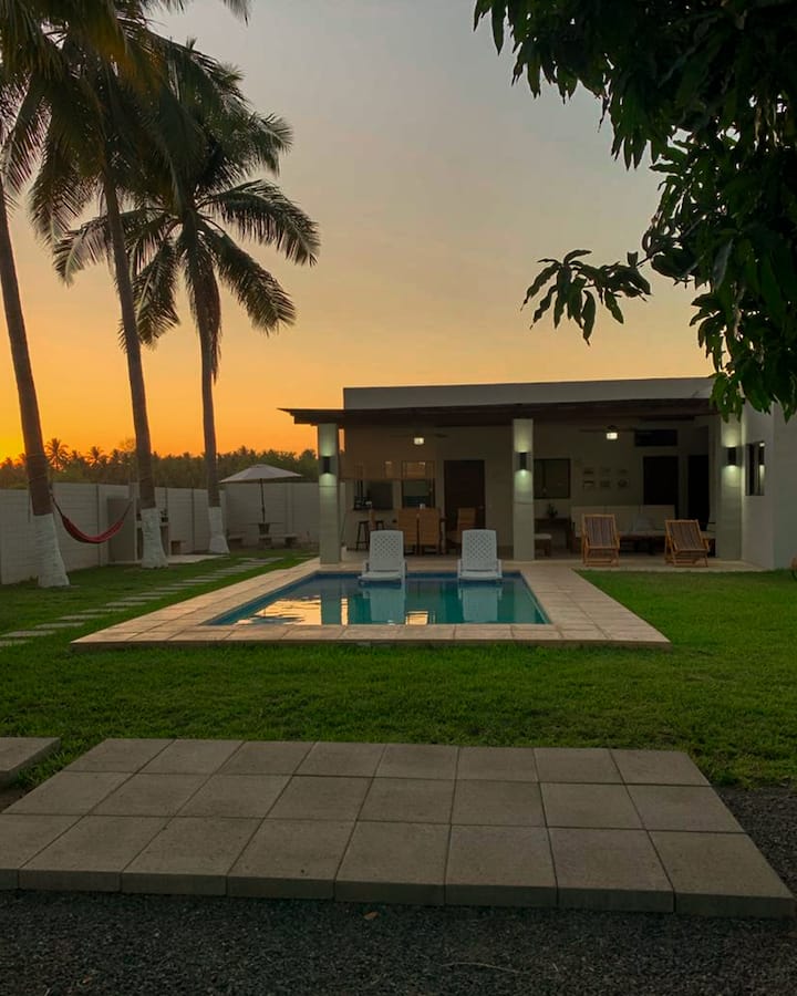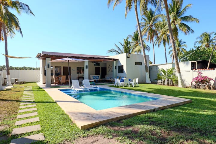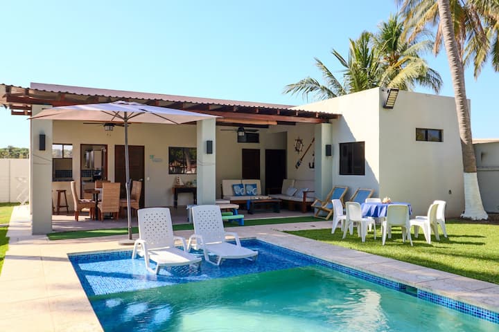 Útulný dom na pláži len 5 minút chôdze od oceánu, ideálny pre rodiny a skupiny. Objekt má 3 spálne, súkromný bazén, priestor na grilovanie, plne vybavenú kuchyňu, priestor s hojdacou sieťou a parkovanie až pre 5 vozidiel. Prijíma až 12 hostí.
