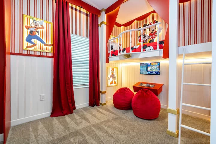 • Spálňa 2 – poschodová izba s tematikou Mickey a Minnie s hravým dizajnom v karnevalovom štýle, kútikom s arkádovými hrami, sedačkou a 3 samostatnými lôžkami ideálnymi pre deti.