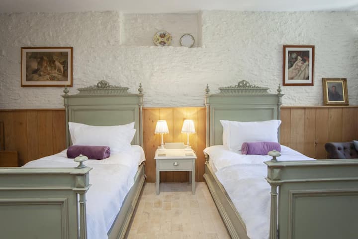 Keď vstúpite do tohto krásne zariadeného objektu, vráťte sa späť v čase. Vydajte sa do otvoreného obytného priestoru, ktorý kombinuje salónik a jedáleň – spoločenské srdce domu. Bielené kamenné steny, drevené stropné trámy a dubové krokvy tu naznačujú bohatú históriu budovy a miešajú sa s moderným, domáckym pohodlím. Užite si podlahové kúrenie, keď prechádzate do salónika, kde objavíte dve pohovky v tvare L usporiadané okolo televízora a krbu na drevo – ideálne prísady na útulný filmový večer. Keď vám kručí v bruchu, vzdušná a dobre vybavená kuchyňa čaká s niekoľkými prvkami, vďaka ktorým je varenie sviatočných hostín potešením. Zhromaždite sa pri priestrannom jedálenskom stole v obývacom priestore a vychutnajte si prácu šéfkuchára alebo sa najedzte vonku v záhrade, keď je pekné počasie. Na konci každého rušného dňa vás v celom objekte čaká päť luxusných spální, všetky s vlastnou kúpeľňou, ktoré ponúkajú vynikajúci nočný spánok. Spálne zahŕňajú tri dvojlôžkové izby a dve útulné dvojlôžkové izby.