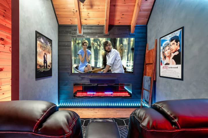 Vychutnáte si plne vybavenú kuchyňu, príjemnú obývaciu izbu s revúcim ohňom a vlastnú divadelnú miestnosť na treťom poschodí — so 75-palcovou HD Smart TV, elektrickými ležadlami a staromódnym strojom na popcorn pre tento skutočný zážitok z kina.