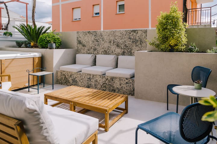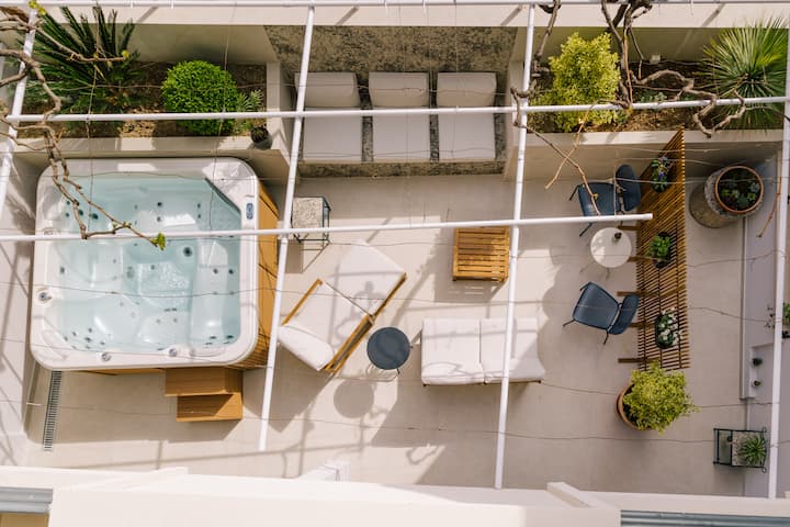 Rozdelený útulný domček s vírivkou a šarmom