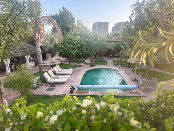 Vitajte vo vile Sidi Oasis, oáze pohodlia v Sidi Moussa, na ceste do Ouriky, len 10 minút od Marrákeša. Samostatná dvojlôžková izba úplne zrekonštruovaná (4 osoby), s manželskou posteľou 160 x 160 cm, vlastnou kúpeľňou, veľkým vyhrievaným bazénom, tradičným hammamom, sporákom a vrátnikom na mieste. Ideálne pre ľudí, ktorí chcú zažiť autentický marocký zážitok s hotelovými službami à la carte a raňajkami v cene.
