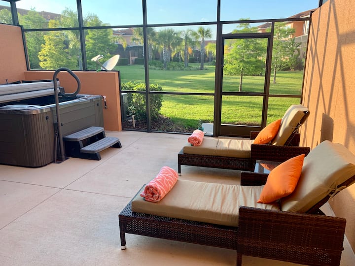 > V obývacej izbe z dvojitých posuvných dverí vedúcich do extra priestrannej súkromnej terasy. Okrem krásnej scenérie je tu súkromné vírivé kúpalisko, v ktorom sa môžete ponoriť a vychutnať si krásne floridské počasie, nábytok na terase, jedálenský stôl a stoličky na oddych s pokojným výhľadom na záhradu.