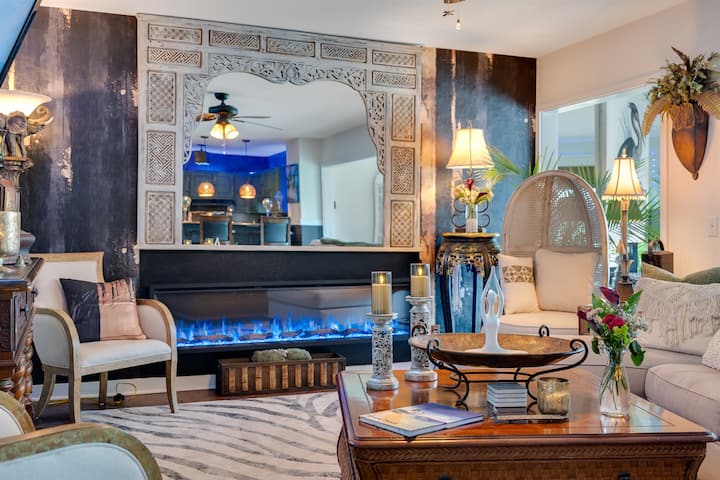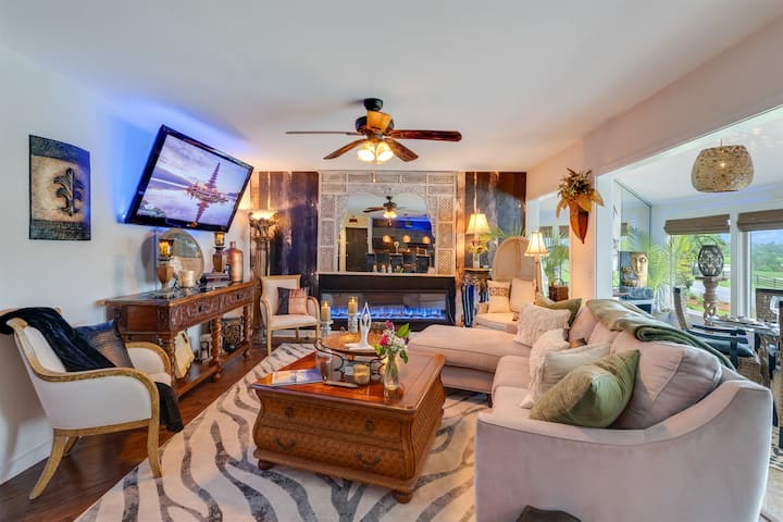Otvorený obývací priestor ponúka nádherný výhľad na golfové ihrisko cez OBROVSKÚ stenu okien v slnečnej miestnosti, doplnený elegantnou indonézskou/stredomorskou výzdobou a pohodlným nábytkom. Unavený po dlhom dni golfu? Zamierte do obývacej izby a stiahnite sa na gauč, aby ste si rýchlo zdriemli. Môžete sedieť na pohodlnom gauči alebo sa schúľať v jednom z útulných kresiel s obľúbenou knihou! Môžete si zapnúť svoj obľúbený seriál alebo film na inteligentnej televízii a oddýchnuť si uprostred popoludnia, aby ste unikli teplu. Veľký 72-palcový krb je možné použiť s teplom alebo bez neho, aby ste vytvorili atmosféru, ktorú chcete. Zásuvka konferenčného stolíka má miesto na balenie darčekov, ktoré je ideálne na oslavu s darčekmi! V tomto kondomíniu sa pohodlne vyspia 3 osoby. Pre vaše pohodlie je k dispozícii bezplatné Wi-Fi, tlačiareň a stohovateľná práčka a sušička.