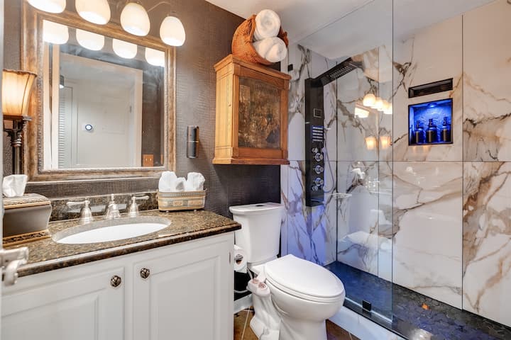 Vlastná kúpeľňa s vlastnou sprchou s dlaždicami pripomínajúcou kúpele má prémiový šampón, kondicionér a telové mydlo, hudobný reproduktor a svetlá na vytvorenie atmosféry. Osušte sa uterákmi luxusnej hotelovej kvality, potom si oblečte vlastné župany Bali Bay a choďte do šatne. V šatni nájdete všetko, čo potrebujete, aby ste sa pripravili na noc v meste, vrátane miesta na líčenie so zväčšovacím zrkadlom, fénom a veľkým šatníkom.