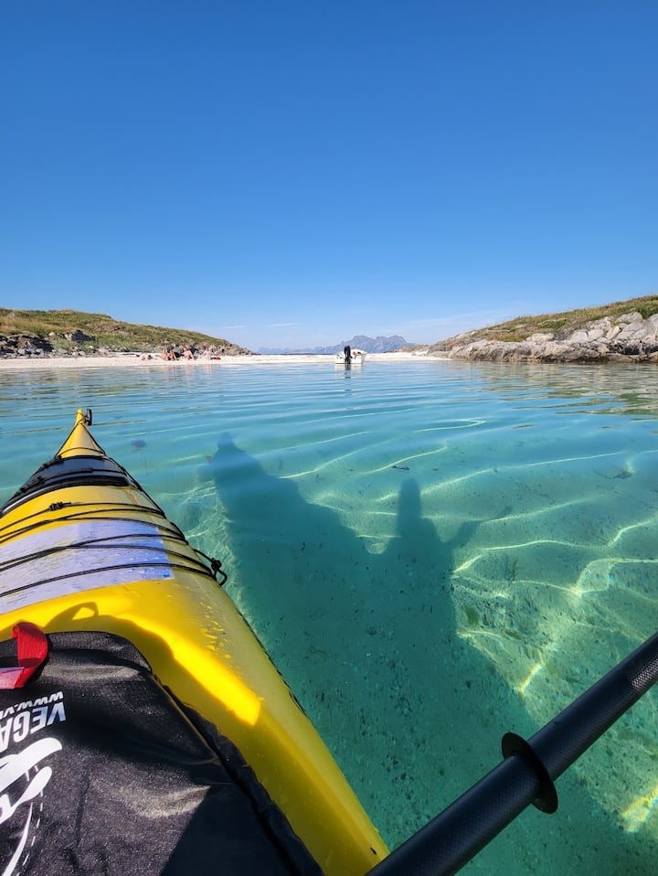 Ponúkame dospelým hosťom prenájom nášho 16-stopového motorového člna poháňaného 30-hp prívesným motorom na rybolov, voľné potápanie, ostrovné skoky alebo len objavovanie. Hosť narodený pred rokom 1980 musí predložiť dostatočný preukaz alebo dokumentáciu na vedenie lode podľa nórskych právnych predpisov. Pred stodolou sú dva kajaky. Dôležité informácie o používaní kajakov a motorových člnov: Nikdy nepádlujte ani neplavte na kajakoch alebo motorových člnoch sami. Je potrebné predložiť platnú licenciu na kajak/våttkort, pretože tieto vody a poveternostné podmienky môžu byť veľmi náročné (a meniť sa bez predchádzajúceho upozornenia) aj pre skúsených kajakárov a nenesieme žiadnu zodpovednosť za vybavenie ani zdravie či bezpečnosť osôb. Za žiadnych okolností nepádlujte ani sa neplavte na motorovom člne mimo vnútorných vôd súostrovia a vždy majte plne nabitý mobilný telefón vo vodotesnej priehradke. Záchranné vesty sú povinné po celý čas na vode a vyžaduje ich nórsky zákon. Záchranné vesty sa nachádzajú v kôlni so vstupom vonku na stene domu smerujúcej na západ.