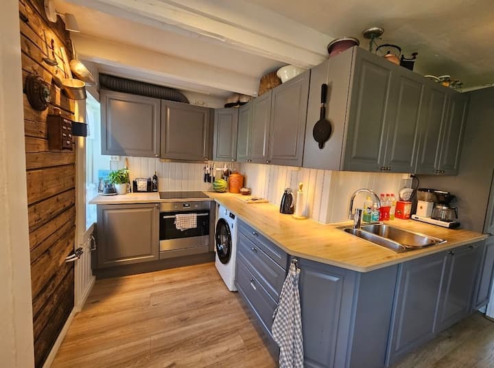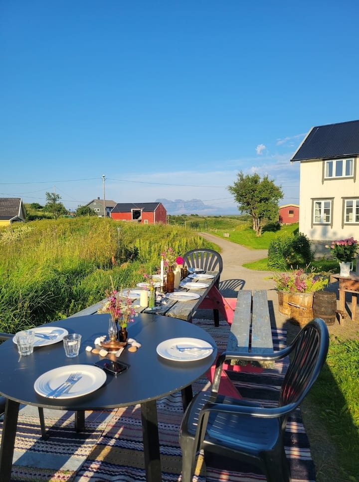Na našej 220 akrovej farme si môžete oddýchnuť a cítiť, ako sa ostrovný čas spomaľuje. Máme šťastie, že máme obchod s potravinami Coop, kde si môžete pohovoriť s jedným z 90 priateľských ľudí žijúcich v tomto súostroví. Vezmite si čerstvú rannú kávu a prejdite sa štyri minúty na vrchol ostrova pri našej letnej stodole, sadnite si a vychutnajte si nádherný 360-stupňový výhľad na Lofoty. 🌅 Dom je naozaj starý a podlaha je tu a tam trochu prachu. Kuchyňa, kúpeľňa a hlavná spálňa sú pomerne moderné, ale zvyšok si zachoval svoj pôvodný šarm, keď bol tento ostrov zvyknutý koncom 19. storočia.