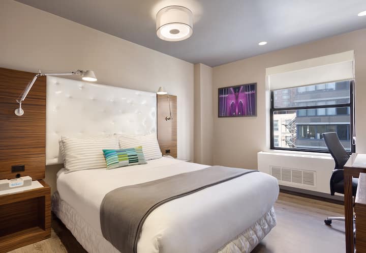 ▶ Útulná, moderná a priamo v srdci diania – táto izba s manželskou posteľou je ideálna pre páry alebo sólo cestujúcich, ktorí chcú cez deň objavovať New York a v noci si oddýchnuť vo veľkom štýle. Je inteligentne navrhnuté so všetkým, čo potrebujete, a ničím, čo nepotrebujete.