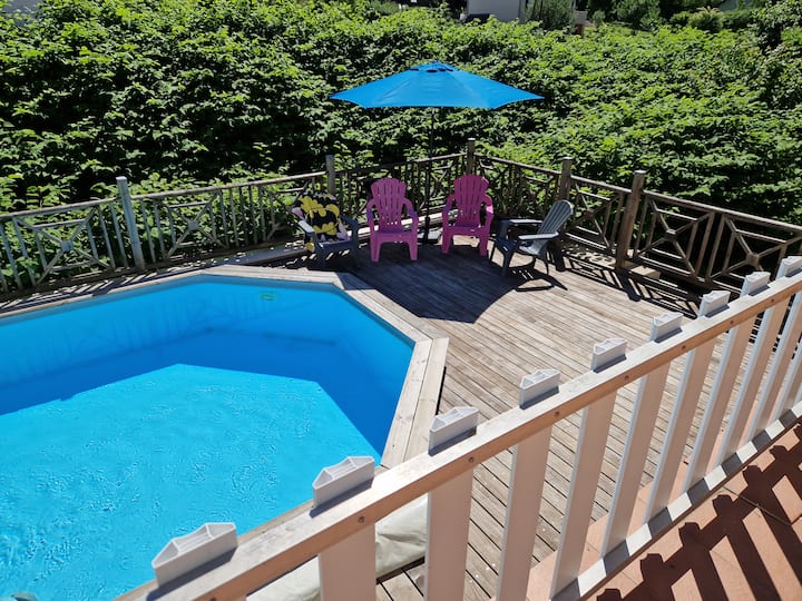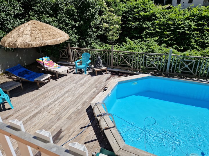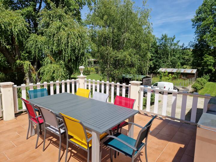 – Veľká zariadená terasa, záhradný nábytok, stoly, slnečníky s výhľadom na Burgundský kanál, priamy prístup do kuchyne a k bazénu.