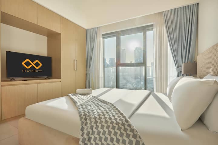 Toto bývanie je navrhnuté tak, aby ponúklo relax a pôžitok. Má dve pokojné spálne s posteľami veľkosti King, priestrannú obývaciu zónu a súkromný balkón, kde si môžete oddýchnuť a zároveň si vychutnať kúzlo centra mesta 🌆. Ideálne pre rodiny, páry a obchodných cestujúcich, ktorí hľadajú prémiový pobyt v Dubaji.