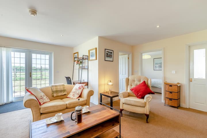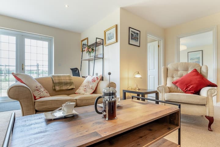 Príchod cez súkromné brány, prechádzajúc otvorenou poľnohospodárskou pôdou pred dosiahnutím spoločnej príjazdovej cesty, kde nájdete parkovanie pre dvoje vozidiel. K vlastnému súkromnému vchodu vedie spevnená cesta s miernym sklonom, ktorá je ideálna pre používateľov invalidných vozíkov alebo osoby s obmedzenou pohyblivosťou. Vstúpte do svetlej a príjemnej chodby, ktorá sa otvára do salónika/kuchyne/jedálne, ktoré sú dokončené v jemných, neutrálnych tónoch. Oddýchnite si na pohodlných pohovkách, zhromaždite sa pri konferenčnom stolíku na rozhovor alebo filmový večer a spoločne sa najedzte pri jedálenskom stole. Kuchyňa je dobre vybavená na jednoduché dovolenkové varenie, či už pripravujete raňajky alebo uvoľnenú večeru. Hneď vedľa salónika sa nachádza spálňa s manželskou posteľou a pokojným výhľadom do záhrady. Moderná sprchovacia miestnosť dopĺňa vnútorné usporiadanie.