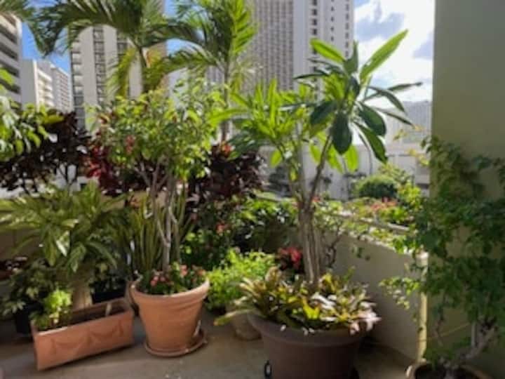 Obrovská súkromná veranda – vo Waikiki je to vzácnosť! Tento vonkajší priestor pripomínajúci záhradu ponúka zeleň, posedenie a ideálne miesto na vychutnanie si rannej kávy alebo večerného pau hana.