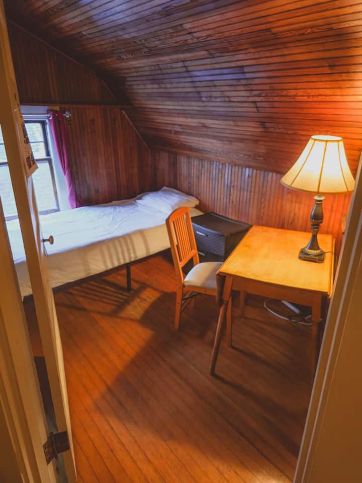 Toto miesto je na 3. poschodí a je veľmi malé. Je dostatočne veľký na to, aby sa v ňom pohodlne vyspal. Výhľad je na susedný dom, ktorý je historický viktoriánsky dom v dobrom stave. Čiastočne sa delí o stenu s dvoma spálňami. Na mieste je teraz posteľ so skutočným matracom. Fotky aktualizujeme, keď budeme mať možnosť.