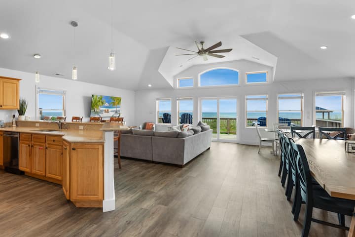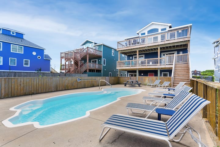 Coastal Haven je vaša vysnívaná dovolenka – priestranný 10-spálňový, 7 plných a 2 polovičné kúpeľne priamo pri oceáne v pokojnom South Nags Head. Tento veľkolepý pobrežný pozemok s nádherným panoramatickým výhľadom a priamym prístupom na pláž cez súkromnú chodníček je ideálny na rodinné stretnutia a vytváranie nezabudnuteľných spomienok na pobreží. Vyjdite von a užite si vlastný súkromný bazén, bublinkovú vírivku a plynový gril na dokonalé jedlá pri bazéne. A nezabudnite sa po dni surfovania a slnka opláchnuť vonkajšou sprchou.
