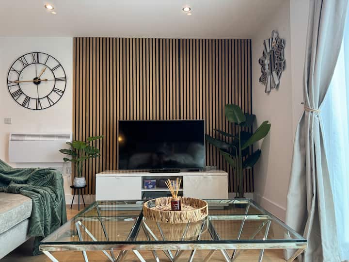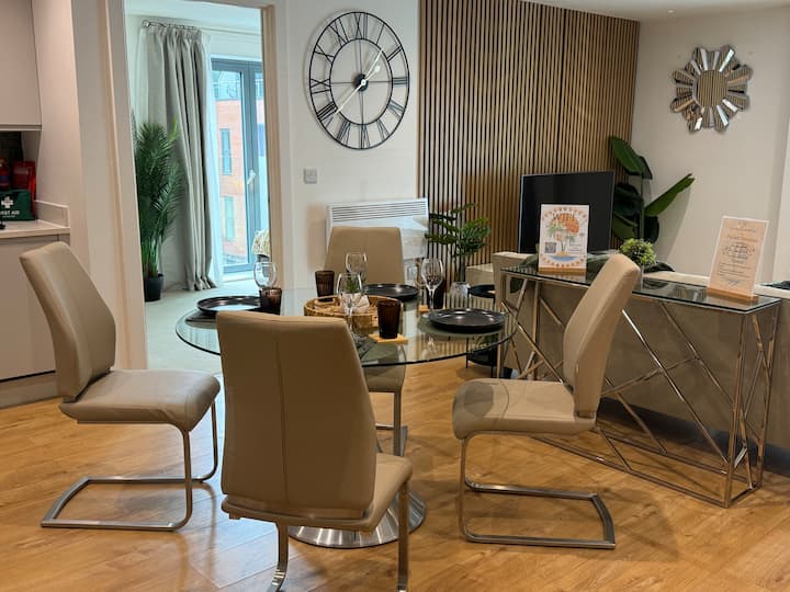 Vitajte v Velvet Leaf Retreat – vašom dizajnovom útočisku v srdci Leedsu. Tento krásne štýlový apartmán s 2 spálňami a 2 kúpeľňami je určený pre cestovateľov, ktorí oceňujú premyslené interiéry, premyslené detaily a pokojnú, ale napriek tomu dobre dostupnú polohu. Či už ste na služobnej ceste, oslavujete niečo špeciálne, alebo si len chcete pohodlne oddýchnuť, tento priestor je skutočným klenotom medzi mestskými dizajnovými pobytmi.