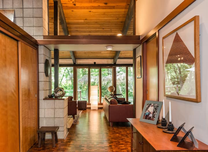 Izby v jedinečnom modernom dome z polovice storočia neďaleko mesta a kampusu