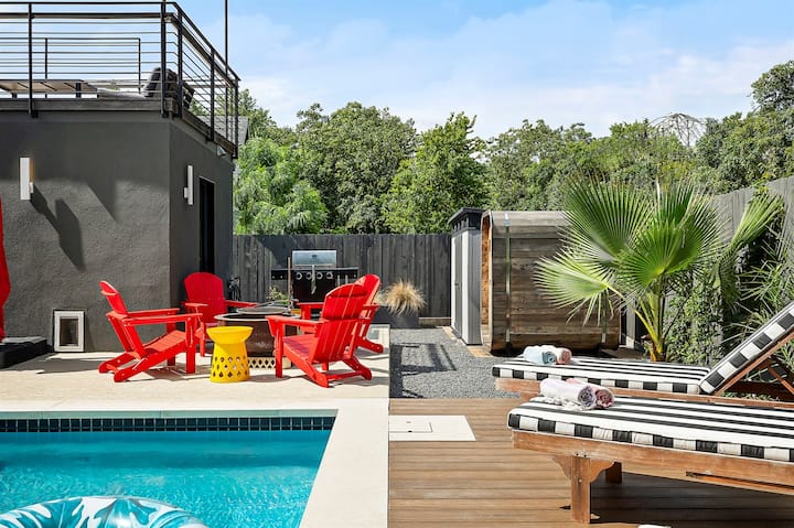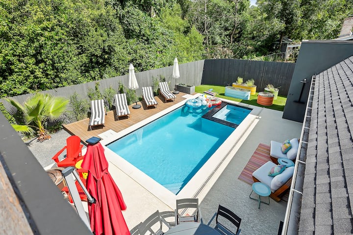 La Buena Vida sa nachádza v tichej štvrti 78704 lemovanej stromami, len 7 minút od centra Austinu. Je to moderný, kúpeľne inšpirovaný únik navrhnutý s ohľadom na rodiny a relaxáciu. Toto priestranné útočisko ponúka upokojujúcu zmes čistého dizajnu, pohodlia a premyslene vybraného vybavenia, ktoré vám pomôže uvoľniť sa, načerpať nové sily a cítiť sa ako doma.