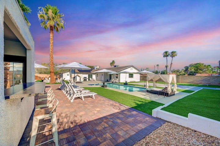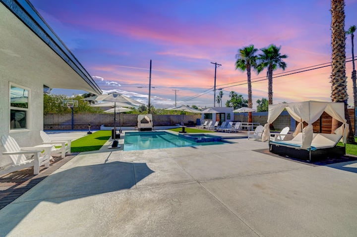 Vegas Cabana Estate je súkromný dom v štýle rezortu v srdci Las Vegas. Toto útočisko sa nachádza na pozemku s rozlohou 2000 m² a ponúka veľký bazén, vyhrievané kúpele, luxusné kabíny, ohniská, rôzne možnosti salónikov a súkromný domček. Športujte na vlastnom pozemku a potom sa zhromaždite pri krbe pod hviezdami. S dvoma obývačkami, vonkajšou kuchyňou a 2 štýlovými jedálňami až pre 16 osôb je to dokonalá zmes zábavy, pohodlia a očarujúceho štýlu Vegas.