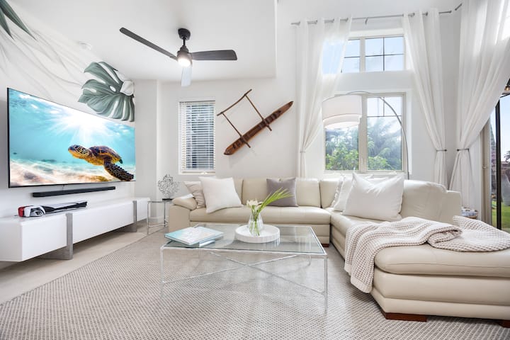 Nadrozmerná, vkusne zariadená a vylepšená rohová jednotka pri oceáne s prístupom na súkromnú pláž Mauna Lani. Vstup do bazéna Hilton je zahrnutý v cene. Výhľad na západ slnka a golf. Nástenné maľby s havajskou tematikou, štýlový apartmán B&W s vlastnou kúpeľňou so sprchovacím kútom a vaňou, spálňa s manželskou posteľou King na 1. poschodí, 15 metrov od parkoviska (bez schodov), zábavná detská izba s 2 oddelenými posteľami/posteľou King na poschodí. Plne zásobená kuchyňa, detské vybavenie (detská jedálenská stolička, vanička), moderná obývacia izba, podkrovie, 2 kancelárske priestory, plážové vybavenie, bicykle, hry, PS5. Bezplatný paddleboard už čaká pri pláži.