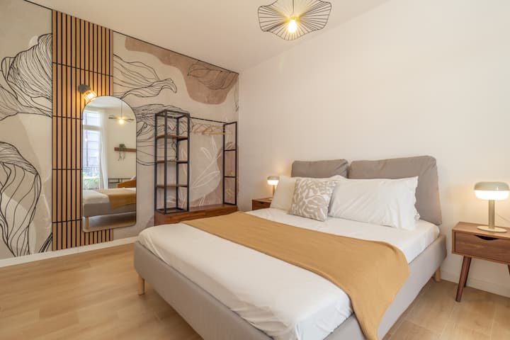 K dispozícii je tiež tichá a útulná spálňa, ktorá pozostáva z pohodlnej manuálne vyrobenej manželskej postele veľkosti Queen vo výške 20 cm, otvoreného šatníka a klimatizácie. Izba má tiež pohodlnú stanicu navrhnutú špeciálne na prácu na počítači alebo štúdium a priamy prístup do súkromnej záhrady.