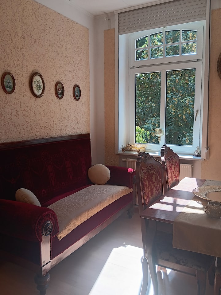 Apartmán Creek je rovnako ako apartmán Handel domu samostatný 2 R-Wo s 52 m² na 1. poschodí v historickej budove v štýle 19. storočia v otvorenej parku v historickej budove v 19. storočí. Historický mestský park pochádza z 19. storočia. Prístup do apartmánu nie je bezbariérový, pretože je tu historické schodisko so schodmi.