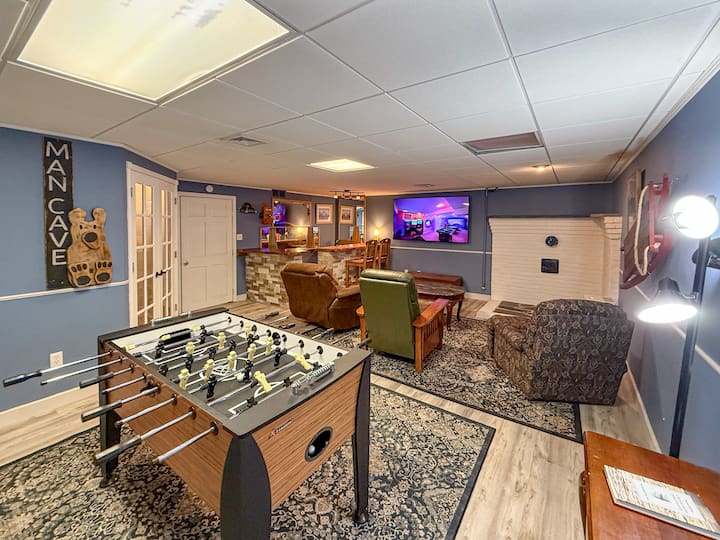 Suterén je vaša súkromná zábavná zóna oddelená od hlavných miestností domu. Sledujte zápasy na 75-palcovej televízii, zahrajte si stolný futbal alebo šípky, stretnite sa pri bare s taburetmi a minichladničkou alebo si v zadnej miestnosti zahrajte poker alebo puzzle. Pre tých, ktorí radi zostávajú aktívni, je tu k dispozícii káblový stroj FTX Functional Trainer, ktorý naštartuje váš deň. Je to ideálny priestor pre rodiny na hranie alebo pre dospelých na odpočinok bez obáv, že zobudia deti na poschodí.