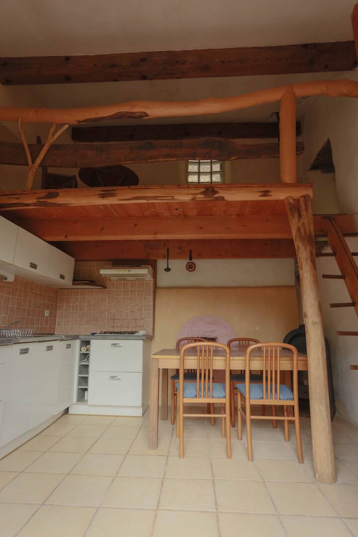 🛌 Uzavretý priestor zahŕňa veľkú vonkajšiu terasu, kuchyňu na prízemí a medziposchodie s manželskou posteľou (140 x 200 cm). V uzavretom priestore je k dispozícii kachle na drevo na zimné použitie.
