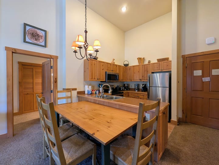 Otvorený priestor plynule prechádza z obývacej izby do plne vybavenej kuchyne a jedálne. Či už pripravujete raňajky pred odchodom na svahy, alebo varíte večeru po dni plnom dobrodružstiev, v kuchyni nájdete všetko, čo potrebujete. Jedáleň je ideálna na spoločné stolovanie, hranie hier alebo plánovanie itinerára na ďalší deň. Vyjdite von na svoj súkromný balkón, nadýchnite sa sviežieho horského vzduchu a vychutnajte si výhľad na malebné okolie Keystone.
