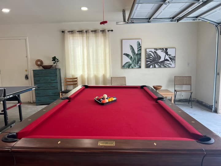 Priestranná obývacia izba má extra veľký mäkký gauč a plochú televíziu so smart TV s bezplatným Netflixom a YouTube TV. Plynový kozub poskytuje teplo počas chladných večerov. K dispozícii je tiež výber kníh a stolových hier pre lenivé dni doma. Klenuté stropy dodávajú tejto časti pocit vznešenosti a priestrannosti, zatiaľ čo sklenené dvere poskytujú dostatok prirodzeného svetla a bezproblémové prepojenie s vonkajším prostredím.