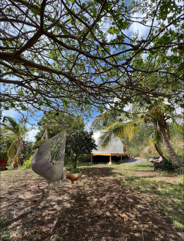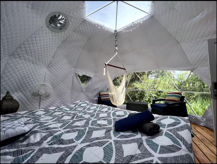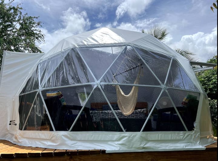 Magická geodetická kupola na ovocnej farme neďaleko oceánu