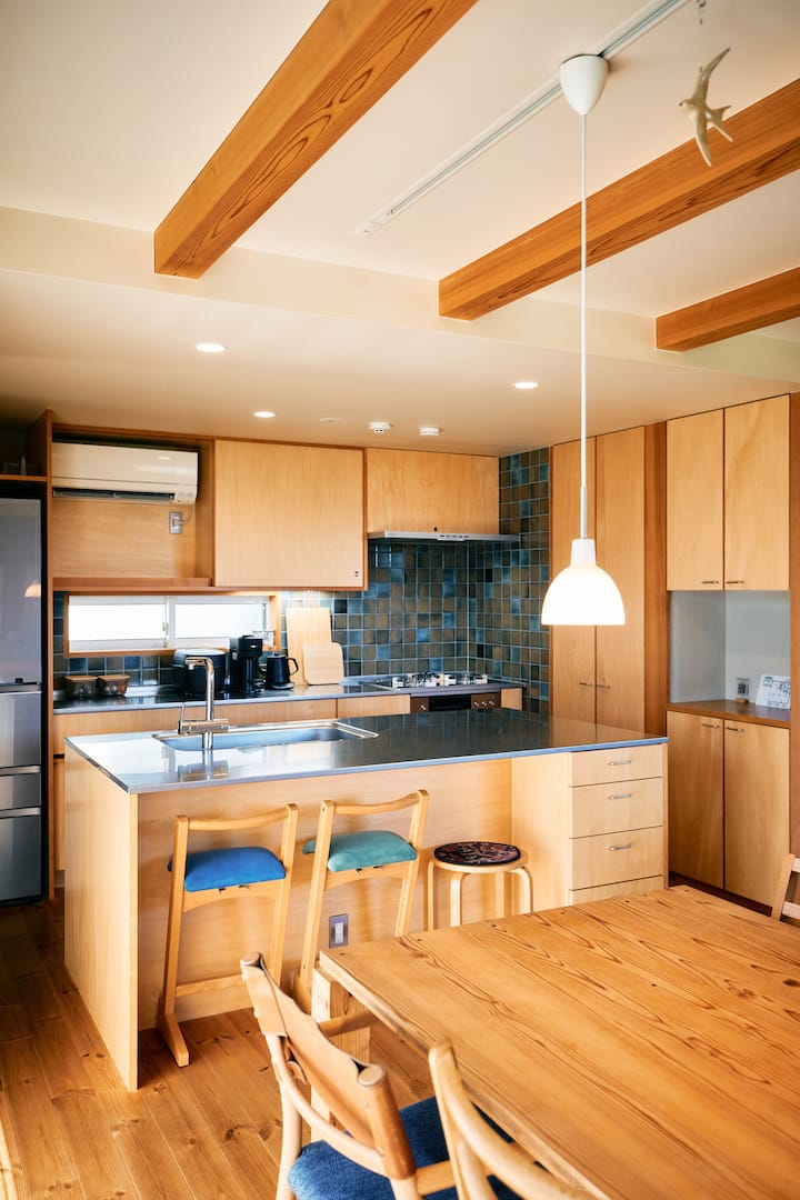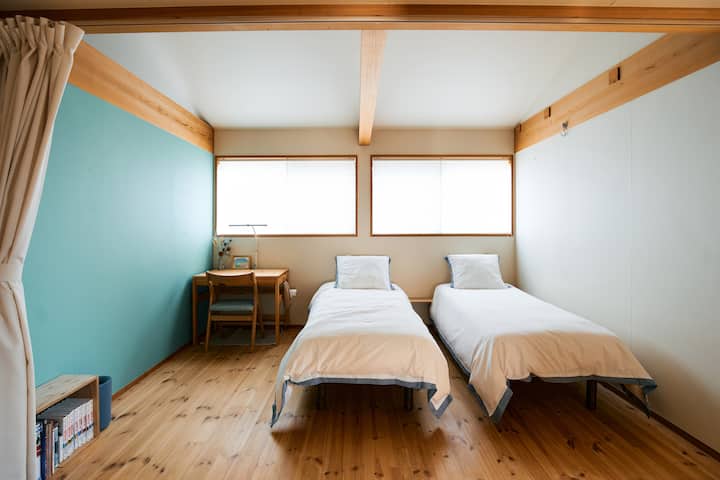 Je to priestranný 2-podlažný dom.Obývacia a jedáleň je priestranná a ideálna na stretnutia s rodinou a priateľmi.Priestranná kuchyňa je vybavená mnohými spotrebičmi, takže si môžete vychutnať pohodlné varenie.Okrem práčky a sušičky je tu aj šatník, WC na 1. a 2. poschodí a množstvo vybavenia a potrieb na podporu pohodlného pobytu.Môžete si tiež oddýchnuť v záhrade alebo si požičať bicykel (za poplatok) a prejsť sa po okolí.Tento dom môže byť využitý na rôzne účely, od prehliadok pamiatok a podnikania až po relaxačný pobyt.