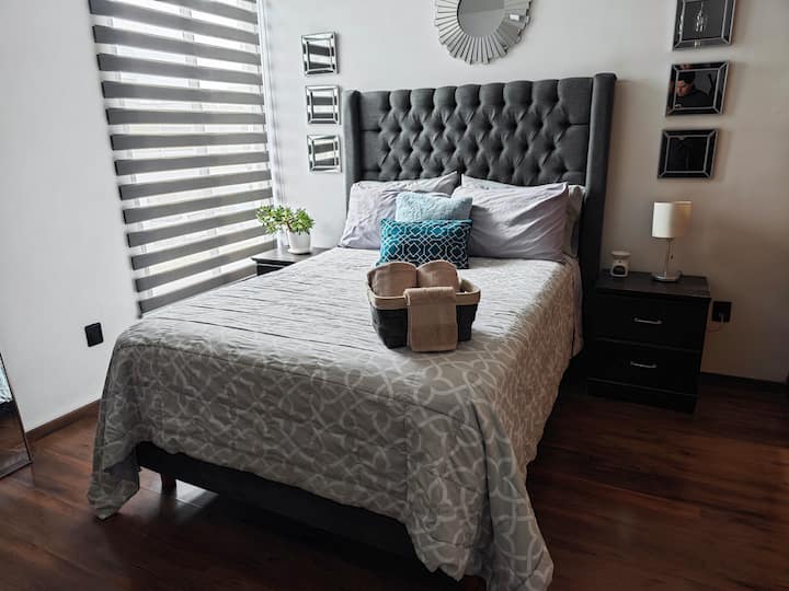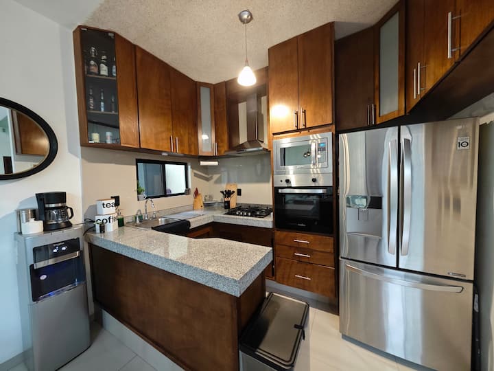 Budete mať k dispozícii plne vybavenú kuchyňu s plynovým sporákom, nezávislou rúrou, mikrovlnnou rúrou a obrovskou chladničkou, aby ste si mohli uložiť všetko, čo sa vám páči, okrem toho, že máte riad zo sadeníc s pohármi, pohármi, príbormi, šéfkuchárskymi nožmi, hrncami, kastrólami, molcajete, dávkovačom vody, skrátka všetko, čo potrebujete na to, čo si predstavujete. A samozrejme áno, má kávovar, hriankovač, kávu a cukor, aby ste mali ráno plné energie a začali to najlepšie!