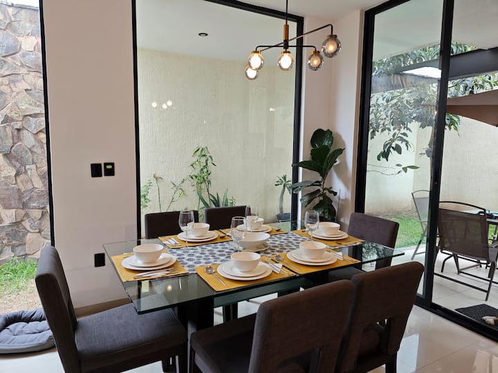 Vychutnajte si peknú večeru v spoločnosti svojich blízkych, majte jedáleň pre 6 osôb priestrannú a pohodlnú obklopenú obrovskými oknami, ktoré vám poskytnú výhľad do záhrady so stromami a rastlinami, kde sa budete cítiť pokojne a zároveň si vychutnávať svoje obľúbené jedlá, a v prípade, že to nestačilo, máte vonkajšiu jedáleň pre 4 ďalších ľudí, ktorí si zároveň vychutnajú otvorenie sklenených dverí, aby spolu žili.