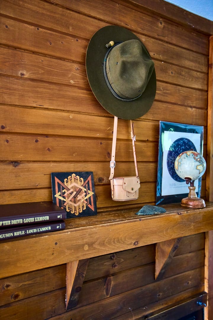 Chata s manželskou posteľou, dreveným kozubom a kuchyňou.