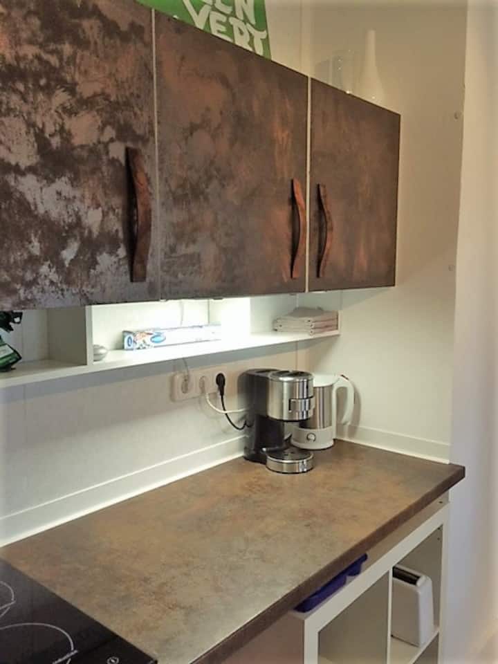 Tento apartmán má kuchynský kút so sporákom, chladničkou, kávovarom, rýchlovarnou kanvicou, hriankovačom a riadom. Ak chcete variť niekoľko kurzov, tento apartmán je nesprávny. Najmä riad pôsobí kempingom (umývadlo s vodou z kúpeľne, bez umývadla, bez umývačky riadu).