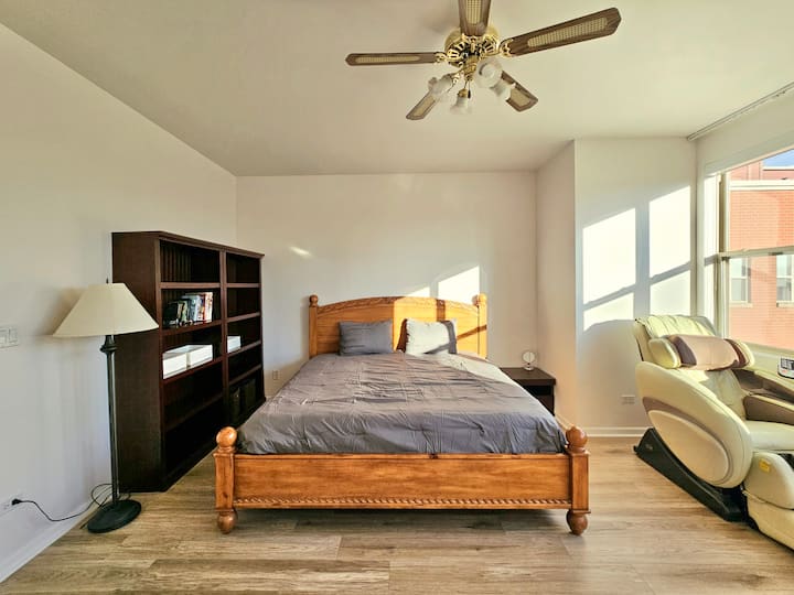 Príďte sa ubytovať do tohto bývania so spoločnou kuchyňou (s ostatnými hosťami), ktoré sa nachádza priamo pri McCormick Place Convention Center! Na konferenciu je to len 5 minút chôdze. Veľmi jednoduché dochádzanie so skvelou polohou na spoznávanie chicagskej štvrte South Loop, Chinatown, 31st Street Beach a veľmi blízko Michiganského jazera! Jednoduché dochádzanie do centra autobusom alebo zaparkujte auto v našej garáži a potom autom do mesta. Zabudnite na svoje starosti v tomto priestrannom a pokojnom priestore. *Wi-Fi nefunguje