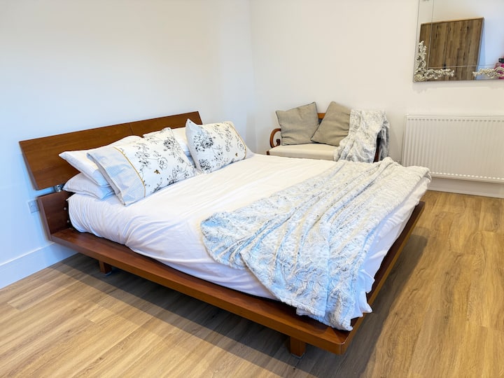 Dve spálne s vlastnou kúpeľňou a manželskými posteľami veľkosti King sú ideálne pre rodinný pobyt pri návšteve, práci alebo presťahovaní sa do tejto oblasti.