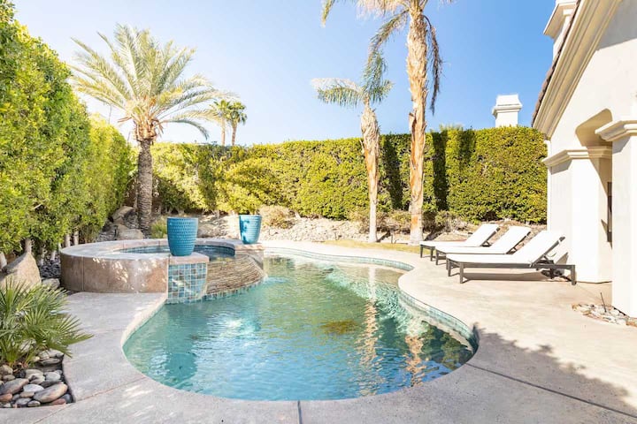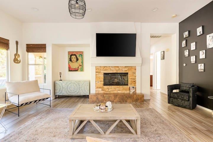 Navigujte pobyty predstavuje vašu súkromnú oázu v Palm Springs: svetlé, slnkom zaplavené útočisko s priestrannou obývacou zónou, útulným kozubom a kuchyňou šéfkuchára, ktorá prechádza do bazéna a kúpeľov v štýle rezortu. Relaxujte na krytej terase, zahrajte si stolný tenis alebo sa stretnite pri vonkajšom kozube v zelenej ohradenom dvore. Štyri príjemné spálne, kúpele ako v spa, rýchle Wi-Fi a práčovňa v domácnosti sú ideálne pre rodiny, skupiny a dlhšie pobyty. Tichá štvrť len pár minút od centra mesta!!! Číslo licencie: 9435
