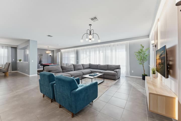 ✅ Priestranná obývacia izba s pohovkami, kreslami, biliardovým stolom a inteligentným televízorom